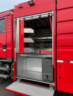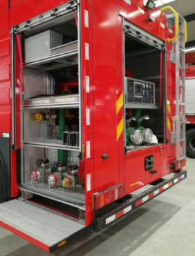 3.2 | 儲物箱:車輛設有(5個)防水、防塵的鋁合金卷簾門,卷簾門觸發(fā)電磁傳感器自動開關(guān)LED照明;在兩側(cè)卷簾門下方設有翻轉(zhuǎn)腳踏板,踏板行程由氣彈簧控制,踏板由整塊特制高強度鋁型材裁剪并與附件無焊接組裝而成、站立面防滑,每個踏板可稱重靜載荷200kg,便于取放儲物箱內(nèi)器材;儲物箱內(nèi)科學合理放置各類器材,固定牢靠、取放便捷。 |